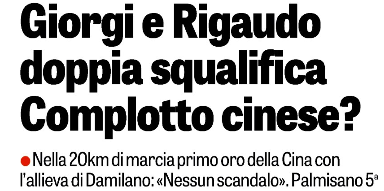 Sabato scorso 29 agosto, un noto giornale sportivo italiano titolava così, a firma di un illustre giornalista sportivo che anche noi stimiamo: “Giorgi e Rigaudo, doppia squalifica. Complotto cinese ?”