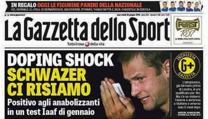 Non possiamo fare a meno di riportare la notizia che appare oggi, in prima pagina, sulla Gazzetta dello Sport, a firma di Claudio Arrigoni, e che è stata ripresa in tutti i telegiornali del mattino (e da altri quotidiani sportivi) dal titolo “Doping shock - Schwazer ci risiamo”.
