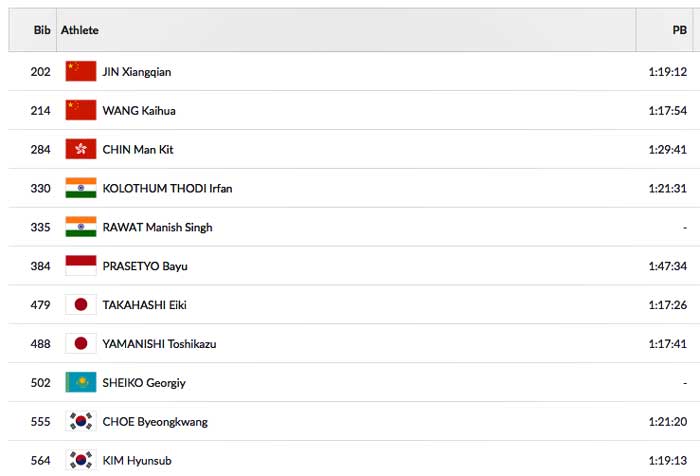 La Cina schiera Wang Kaihua capace quest'anno di 1:19:45 ad inizio stagione a Huangshan (CHN) il 3.3.2018 e Jin Xiangqian che sempre a Huangshan ha ottenuto il tempo di 1:20:56. Entrambi i due atleti hanno però dei personal best inferiori.