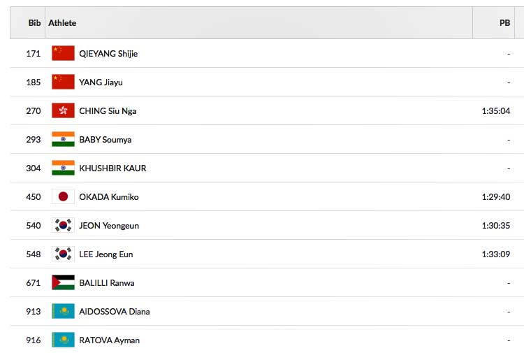 Di seguito la graduatoria aggiornata dell'Asia sulla 20km donne (prime 11 posizioni):