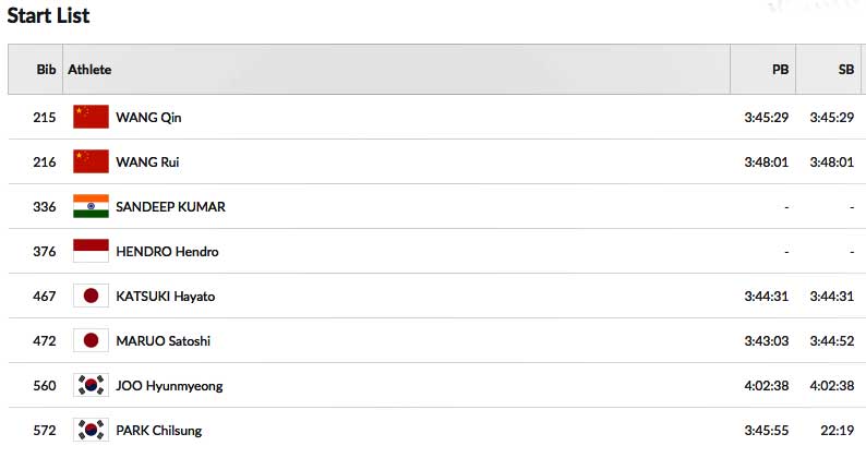 Poco dopo si stacca anche Jin Xiangqian (CHN). I due di testa proseguono appaiati su un ritmo decisamente spedito. Ai 15 km. il passaggio avviene in 1:02:02 (in 19.56 i 5 km. dai 10km ai 15km).