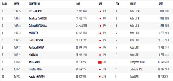 - E' ancora più impressionante rilevare che a livello di Asia i dieci atleti che vanno a formare la velocità media del 2018 (15,20km/hr) ben nove sono provenienti dal Giappone, e che ben sette di queste performances sono ottenute nella 20km di Kobe a inizio stagione.